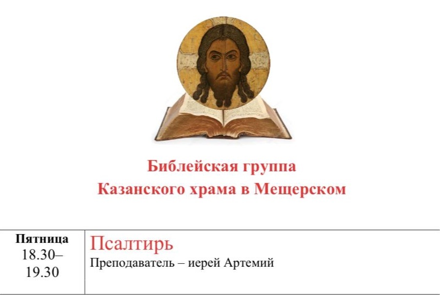Кроме того, с 5 декабря, по пятницам вечером после службы (ориентировочно в 18.30) - мы начинаем еженедельное занятие Библейской группы. Начнем мы с изучения Псалтири. Занятия будут проходить в крестильном храме. На каждом занятии будет разбираться одна кафизма. Подробности о методике и практике молитвенного изучения Псалтири - непосредственно на занятии.